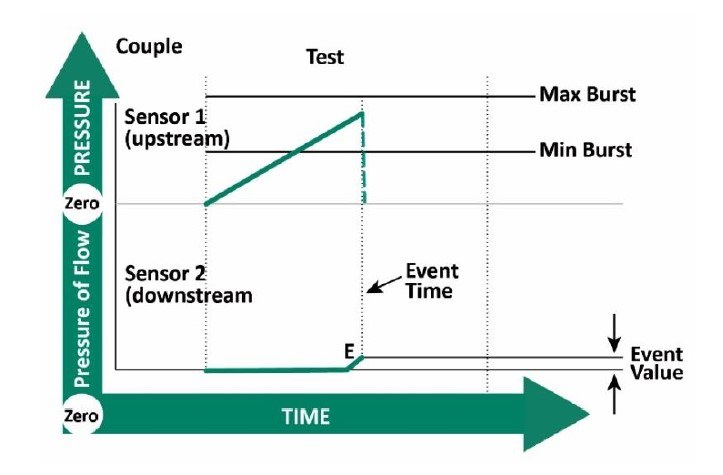 Für diesen Test verwendet das Prüfgerät zwei Sensoren. Der Standard-Messwertaufnehmer misst den Druckanstieg auf der Eingangsseite des Prüfteils. Der zweite Sensor befindet sich auf der Ausgangsseite (Downstream). Das „Öffnungsereignis“ (Crack Event) wird als Änderung des Drucks oder des Durchflusses auf dieser Ausgangsseite definiert.